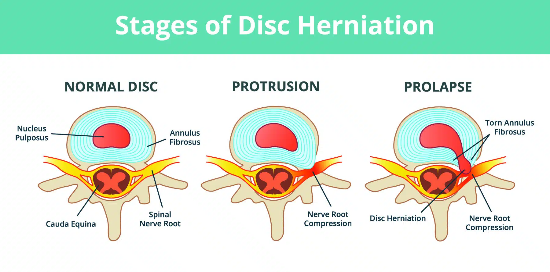 A disc herniation occurs when the soft, gel-like center of an intervertebral disc (nucleus pulposus) pushes through a tear in the tough, fibrous outer layer (annulus fibrosus). This disc protrusion can compress or irritate the nearby spinal nerves, causing pain and inflammation. The pain can be localized to the back or radiate to other parts of the body, such as the buttocks, legs, or feet, depending on the location of the herniated disc and the affected nerves.